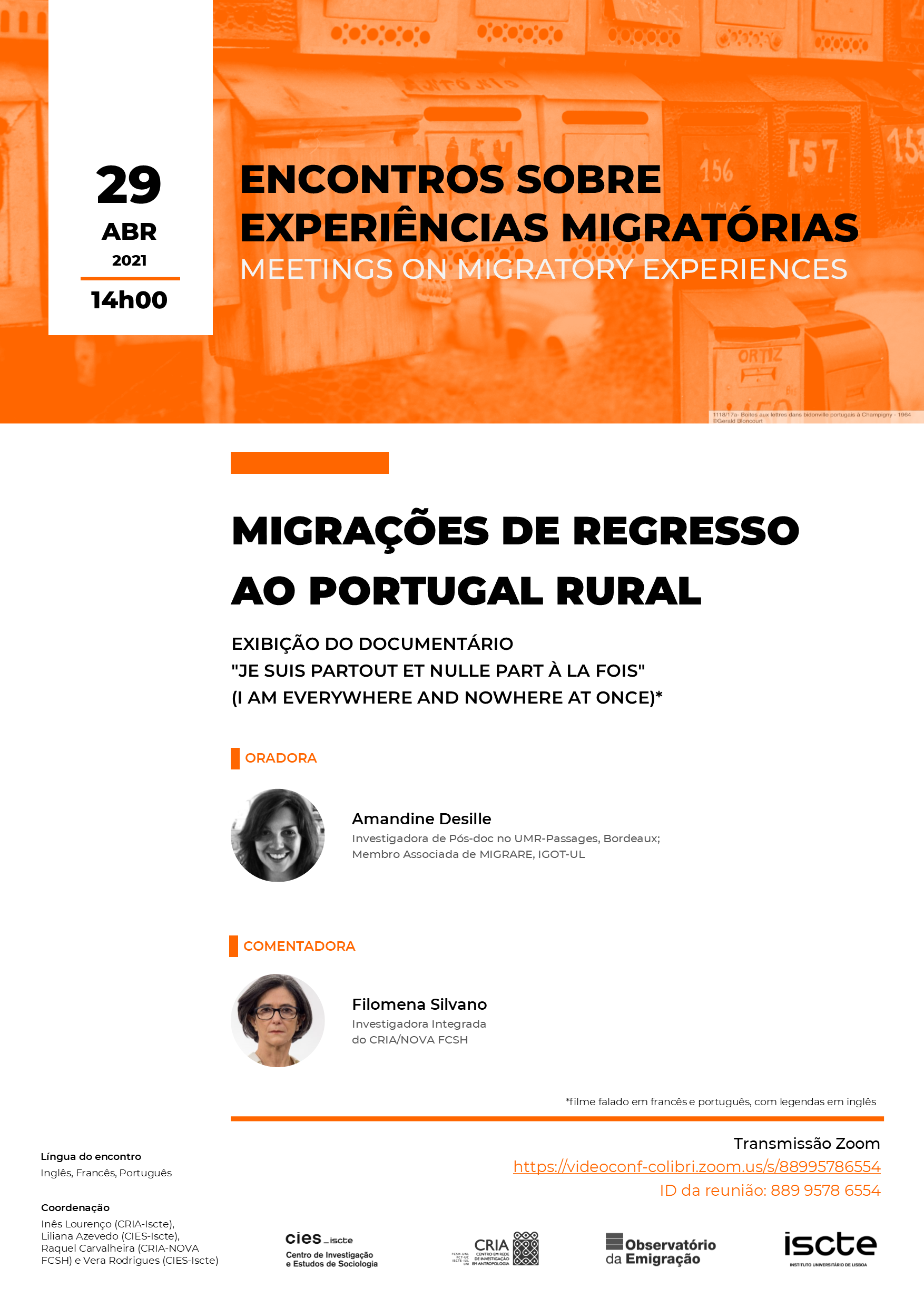 Nesta sessão será exibido o filme documentário "Je suis partout et nulle part à la fois" (2021, 42'), seguido de discussão com Amandine Desille, Investigadora de Pós-doctoramento no UMR-Passages, Bordeaux; Membro Associada de MIGRARE, IGOT-UL e Filomena Silvano, Investigadora Integrada do CRIA/NOVA FCSH.