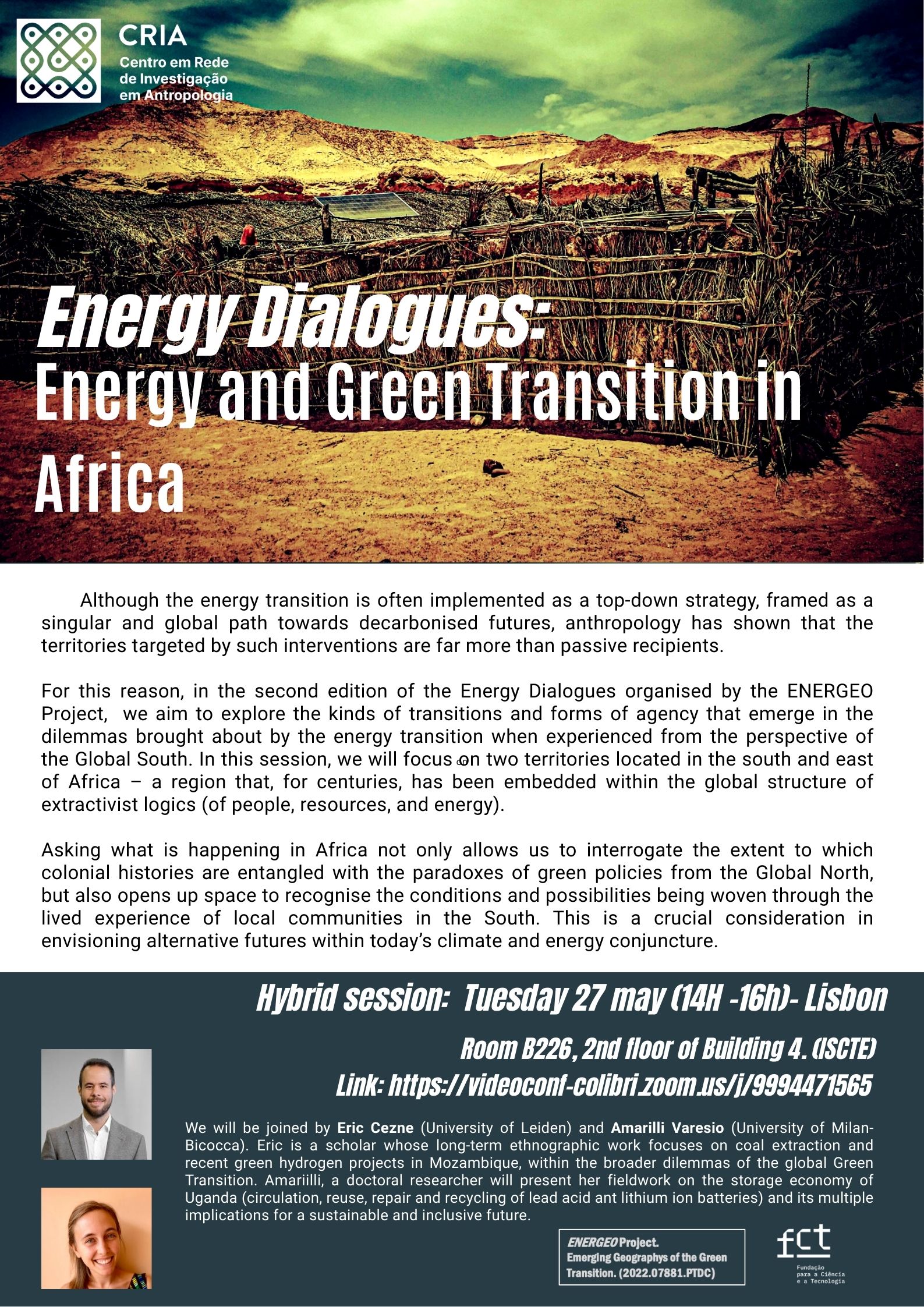 For this reason, in the second edition of the Energy Dialogues organised by the ENERGEO Project, we aim to explore the kinds of transitions and forms of agency that emerge in the dilemmas brought about by the energy transition when experienced from the perspective of the Global South. In this session, we will focus onon two territories located in the south and east of Africa – a region that, for centuries, has been embedded within the global structure of extractivist logics (of people, resources, and energy).