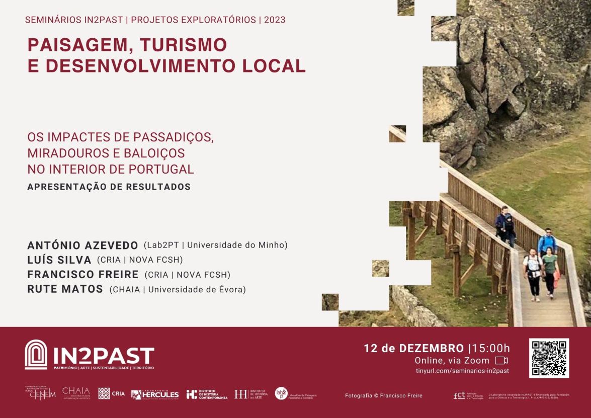 Nesta sessão online serão apresentadas as conclusões do estudo exploratório IN2PAST (EXPL/In2Past/2023/03): Nos últimos anos, temos assistido à instalação de passadiços, miradouros e baloiços um pouco por todo o território nacional, tendo em vista o aumento da atratividade turística dos seus locais de implantação e dos respetivos municípios. Os impactes locais assim como o perfil dos utilizadores destes equipamentos permanecem inexplorados na literatura académica. Este projeto exploratório visa colmatar esta lacuna de conhecimento, mediante o estudo das repercussões dessas construções em termos socioeconómicos, ambientais, turísticos, culturais e paisagísticos a nível local, bem como do perfil sociodemográfico dos visitantes.