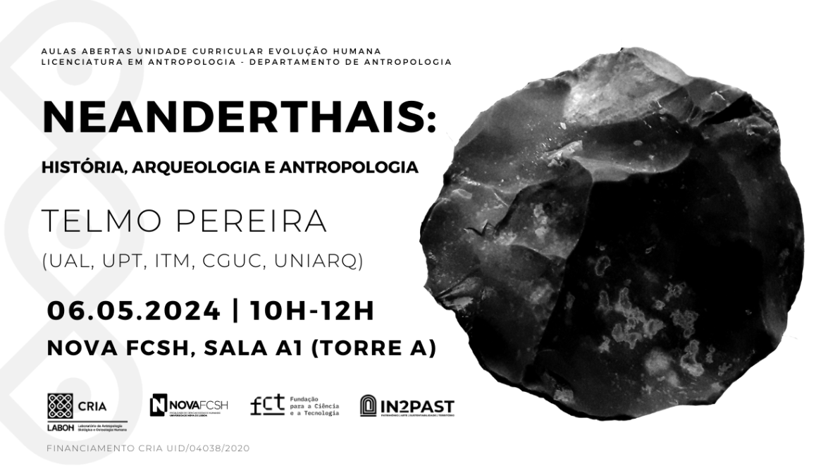 A nova sessão das Aulas Abertas Unidade Curricular Evolução Humana da Licenciatura em antropologia - Departamento de Antropologia da NOVA FCSH será leccionada por Telmo Pereira, investigador da Universidade Autónoma de Lisboa, Instituto Politécnico de Tomar, Instituto Terra e Memória, Centro de Geociências da Universidade de Coimbra, Universidade de Coimbra e UNIARQ - Centro de Arqueologia da Universidade de Lisboa.