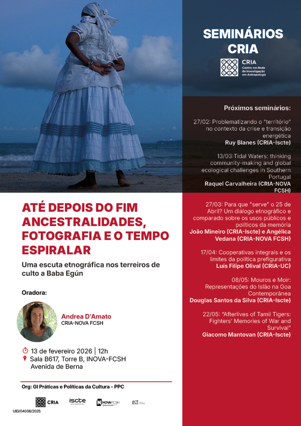 Os Seminários CRIA 2025–2026 constituem um ciclo anual que reúne, num calendário comum, os quatro grupos de investigação, promovendo a apresentação e discussão de investigações em curso, projetos de investigação, bem como livros e outras publicações científicas.