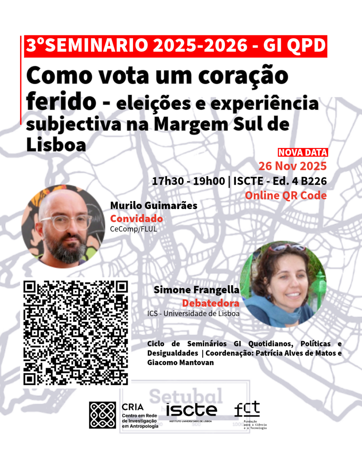 O Centro em Rede de Investigação em Antropologia (CRIA), através do GI Quotidianos, Políticas e Desigualdades, anuncia o seminário “Como vota um coração ferido – eleições e experiência subjetiva na Margem Sul de Lisboa”, dedicado à análise das dinâmicas eletorais a partir das vivências pessoais dos seus participantes.