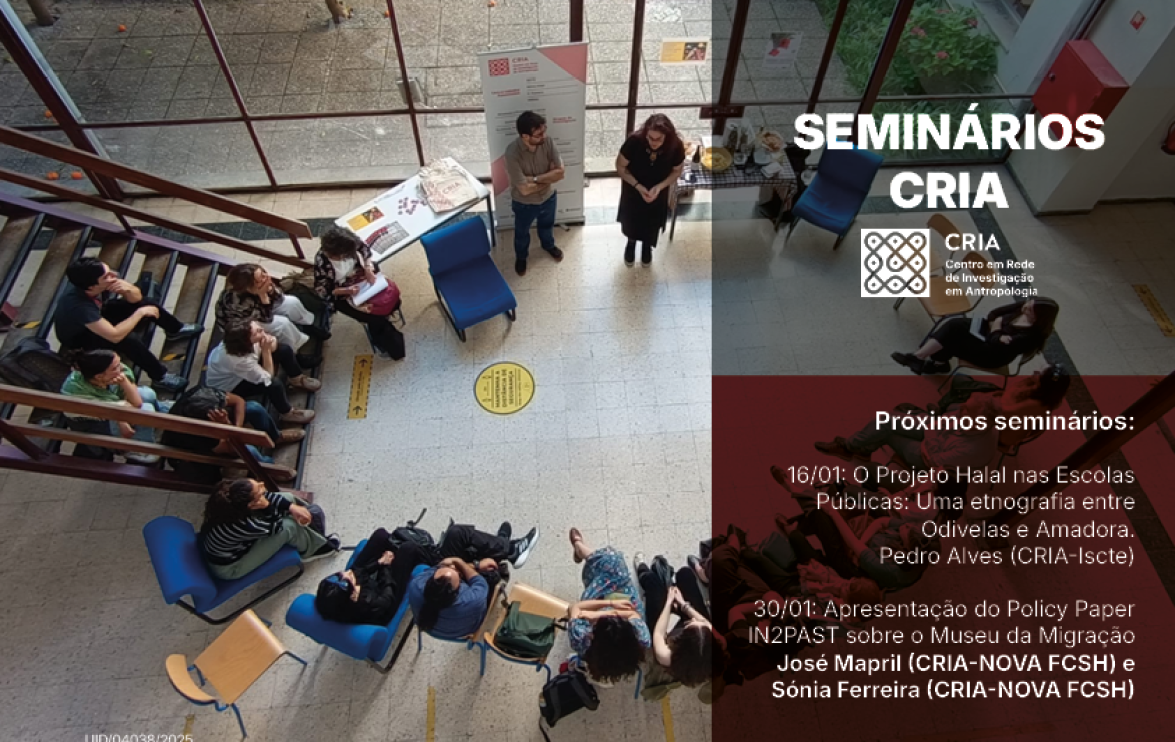 Os Seminários CRIA 2025–2026 constituem um ciclo anual que reúne, num calendário comum, os quatro grupos de investigação, promovendo a apresentação e discussão de investigações em curso, projetos de investigação, bem como livros e outras publicações científicas.
