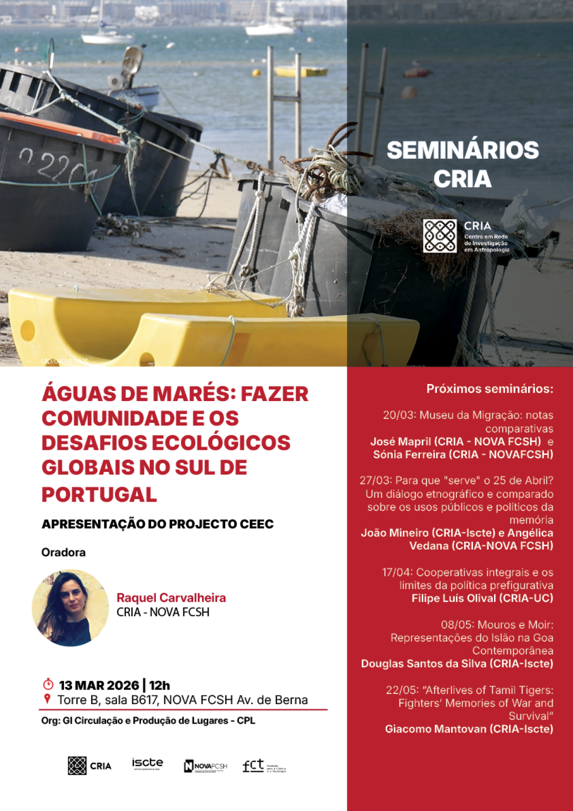 Os Seminários CRIA 2025–2026 constituem um ciclo anual que reúne, num calendário comum, os quatro grupos de investigação, promovendo a apresentação e discussão de investigações em curso, projetos de investigação, bem como livros e outras publicações científicas.
