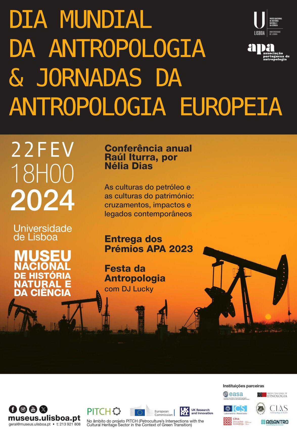 O CRIA divulga a celebração do Dia Mundial da Antropologia 2024 & Jornadas da Antropologia Europeia, uma iniciativa organizada pela Associação Portuguesa de Antropologia (APA), que terá início com a Conferência anual da APA Os cruzamentos e impactos das culturas do petróleo nas culturas do património, por Nélia Dias, pelas 18:00 no histórico Anfiteatro Chímico do Museu. Seguir-se-à a entrega dos Prémios APA 2023, às 19:00, e meia hora depois terá início a Festa da Antropologia, com DJ Lucky.