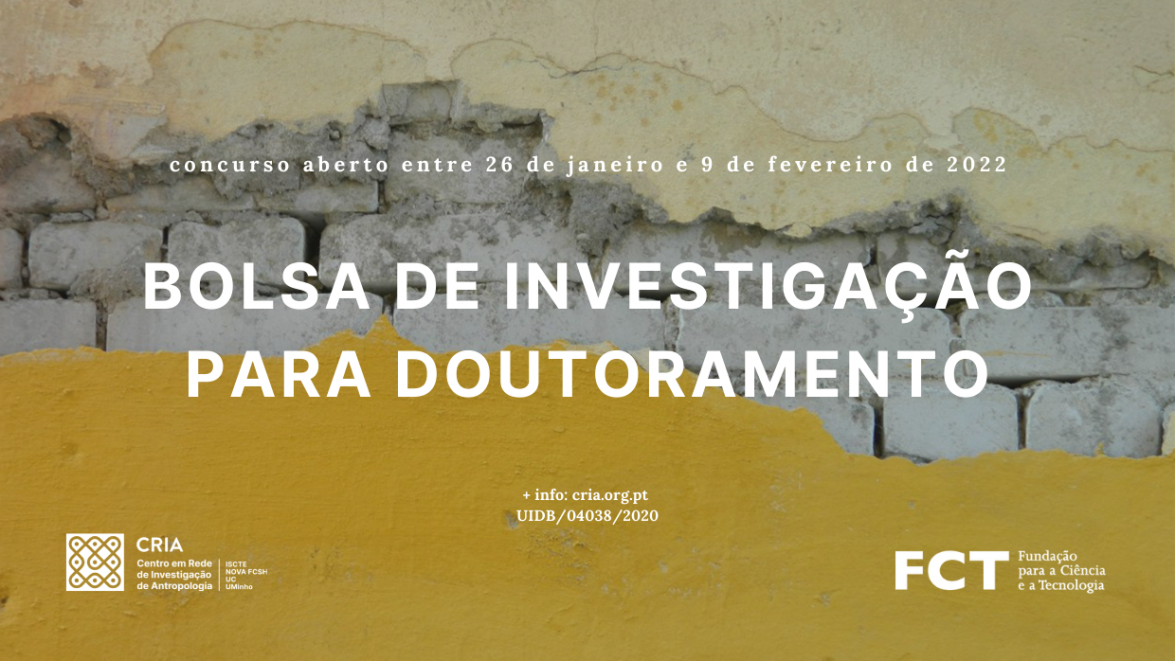 O Centro em Rede de Investigação em Antropologia (CRIA) abre concurso para atribuição de 1 (uma) Bolsa de Investigação para Doutoramento, na área de Antropologia, ao abrigo do Regulamento de Bolsas de Investigação da FCT (RBI) e do Estatuto do Bolseiro de Investigação (EBI).