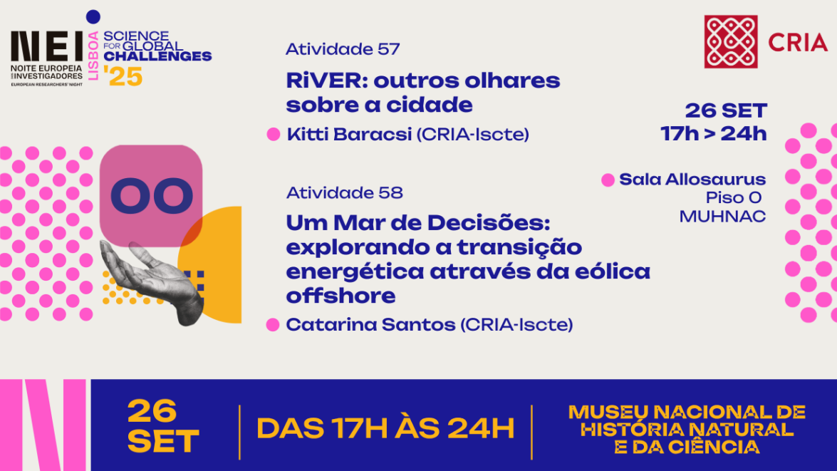O CRIA marca presença na edição de 2025 da Noite Europeia dos Investigadores (NEI), que decorre em Lisboa no próximo dia 26 de setembro, no Museu Nacional de História Natural e da Ciência (MUHNAC) da Universidade de Lisboa. Entre as 17h e as 24h, o público é convidado a participar em duas atividades interativas que cruzam ciência, arte e reflexão coletiva sobre os desafios contemporâneos.