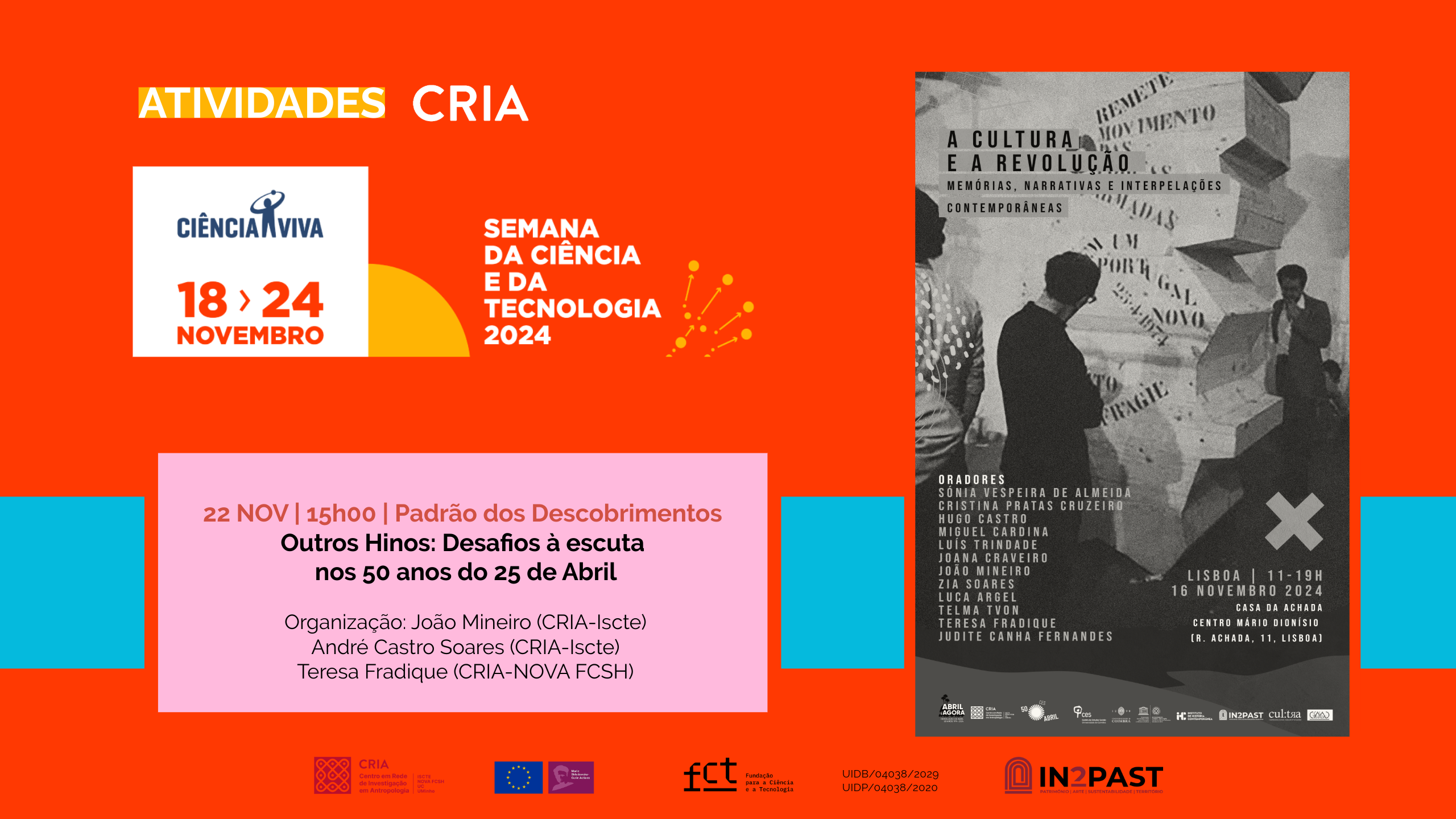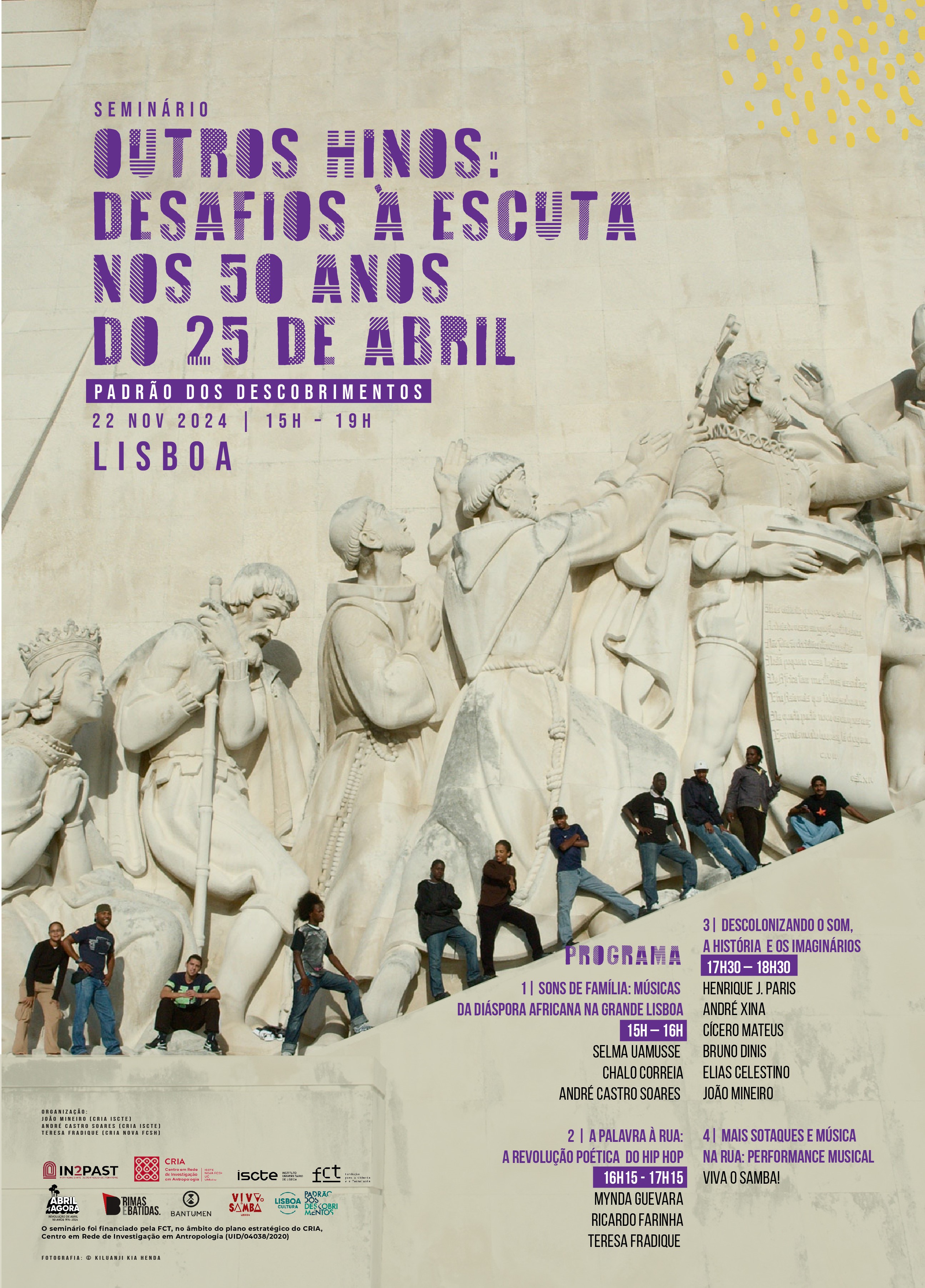 Organização: João Mineiro (CRIA ISCTE) | André Castro Soares (CRIA ISCTE) | Teresa Fradique (CRIA NOVA FCSH) Apoios: Plataforma BANTUMEN | Revista Rimas e Batidas | Padrão dos Descobrimentos | Campanha “Abril é Agora: 50 anos 1974-2024”.