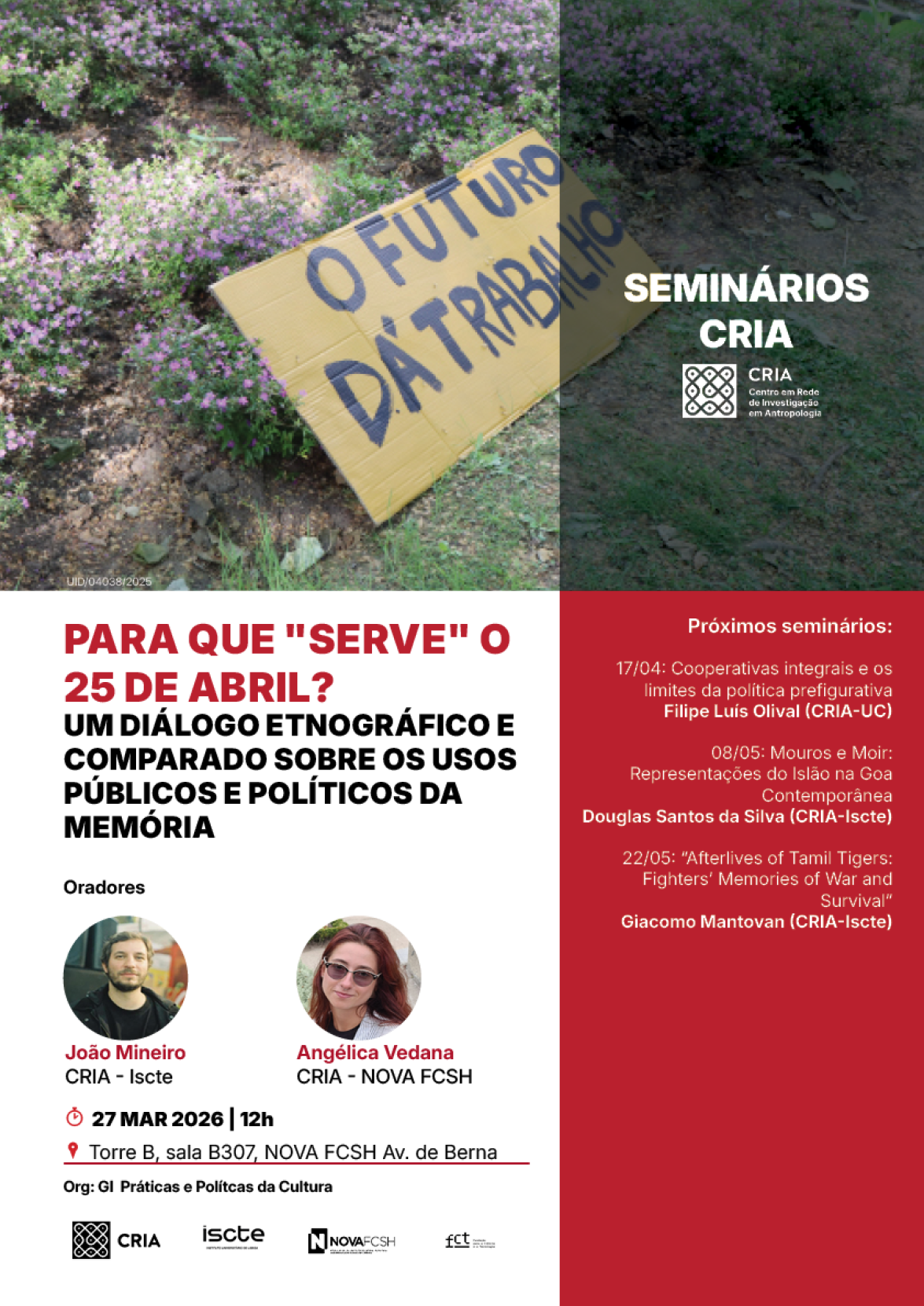 A iniciativa tem como objetivo reforçar a partilha de trabalho científico e promover o diálogo entre diferentes áreas de investigação, oferecendo uma visão abrangente dos temas, abordagens e metodologias que caracterizam a produção científica do CRIA. Os encontros realizam-se sempre às sextas-feiras, pelas 12h.