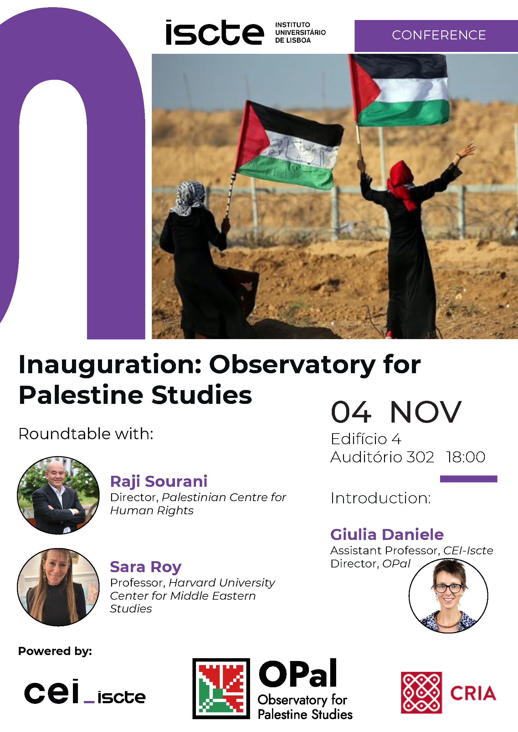 with Giulia Daniele (CEI-Iscte and Coordinator of the Observatory for Palestine Studies) , Raji Sourani (Director of Palestinian Center for Human Rights and Sara Roy (Professor Harvard University / Associate of the Center for Middle Eastern Studies)