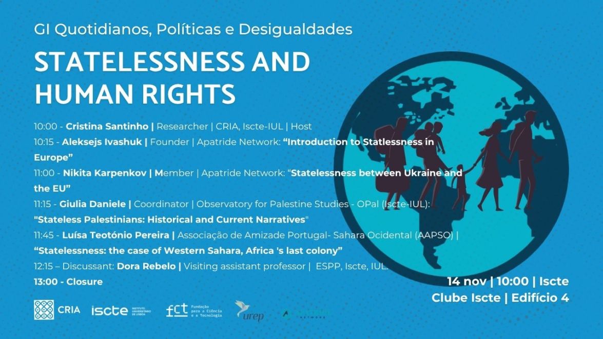 Com este seminário, aberto à comunidade ISCTE e também ao público em geral interessado no tema, pretende-se dar a conhecer e aprofundar a noção de apatridia: pessoas sem estado e sem nacionalidade reconhecida - e o que essa condição representa em termos de perda de direitos humanos (privação de direitos e serviços essenciais como educação, saúde, trabalho e mobilidade. Essa situação pode ocorrer por discriminação, falhas na legislação nacional ou conflitos de leis).